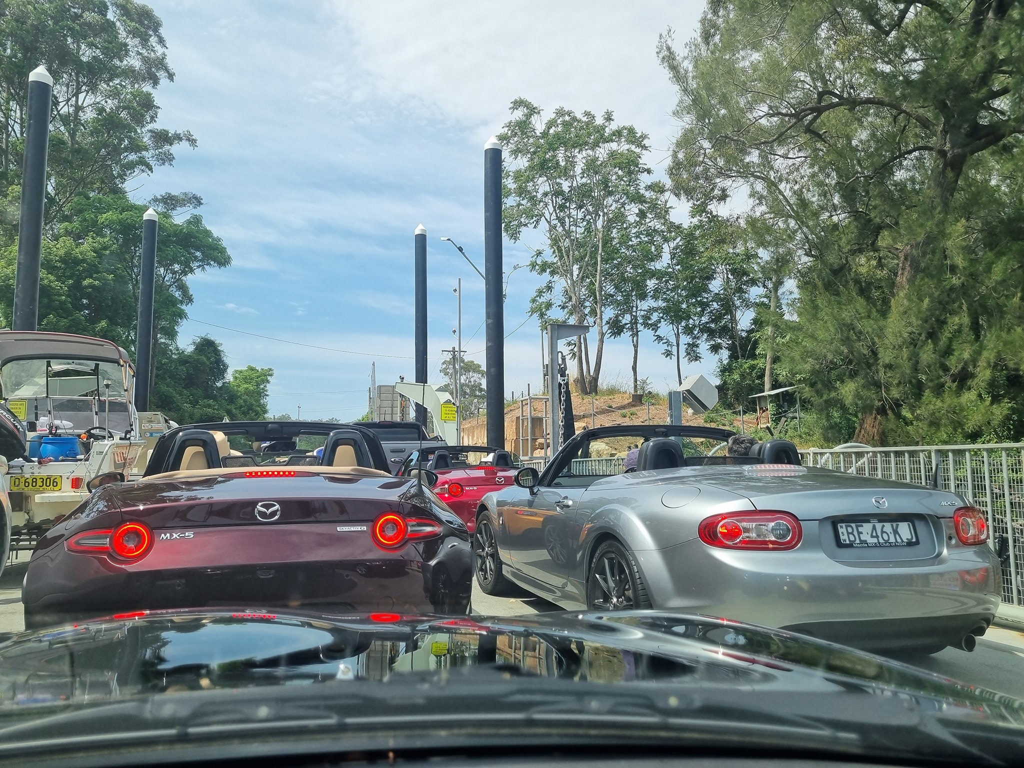 We set off on a beautiful clear morning from Dural with our tops down hoping the weather forecasters were incorrect about the predicted heatwave conditions. Our group of 9 MX5s meandered through the backroads enjoying the drive through the picturesque countryside of Cattai, South Maroota and down to the Sackville Ferry. We managed to get all cars aboard the ferry across the Hawkesbury giving us plenty of time for our break at Ebenezer Church.